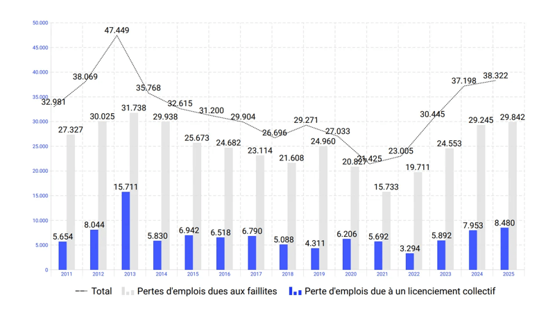 Le SPF Emploi, Travail et Concertation sociale a publié de nouveaux chiffres Statistiques relatives aux restructurations. En 2025, 112 entreprises ont annoncé des licenciements collectifs, 8 428 travailleurs ont appris que leur emploi pourrait être menacé. Ceux-ci s'ajoutent aux 29 842 emplois perdus dans le cadre de faillites en 2025 (Statbel).