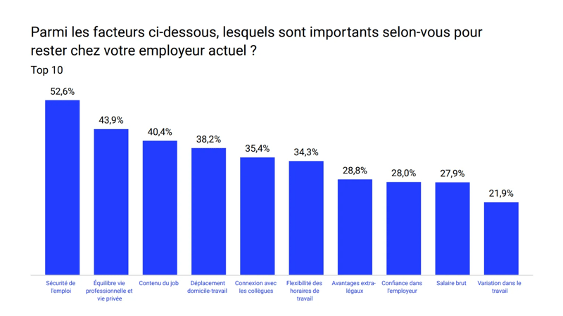 Nous vivons une période d'incertitude économique, ce qui a également un impact sur le marché du travail. Une enquête menée par le prestataire de services RH Partena Professional auprès de 2 000 travailleurs révèle que la sécurité de l'emploi est le principal facteur (52,6 %) qui motive les travailleurs belges à rester chez leur employeur actuel. L'équilibre entre vie professionnelle et vie privée (43,9 %), le contenu du travail (40,4 %) et les déplacements domicile-travail (38,2 %) jouent également un rôle important.