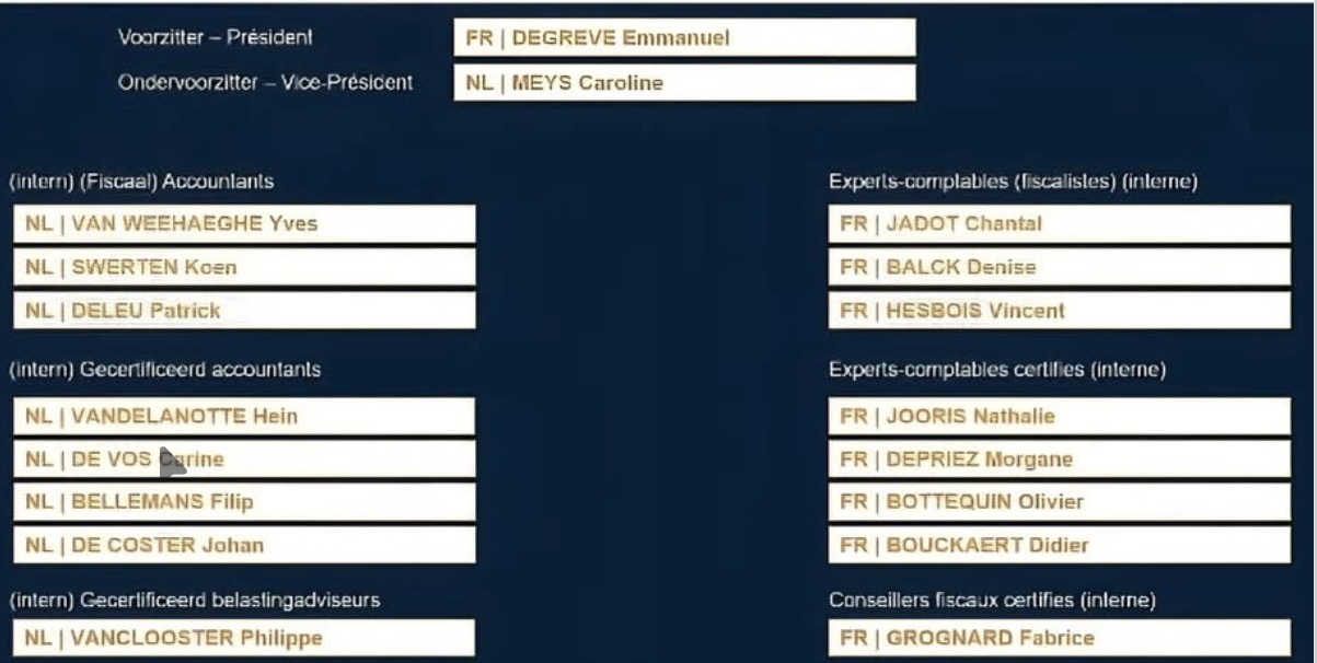 Yves Van Weehaeghe, Koen Swerten, Patrick Deleu, Hein Vandelanotte, Carine Schraepen-De Vos, Filip Bellemans, Johan De Coster, Philippe Vanclooster, Chantal JADOT, Denise Balck, Vincent Hesbois, Nathalie Jooris, Morgane Depriez, Olivier Bottequin, Didier Bouckaert et Fabrice Grognard sont les 16 nouveaux conseillers.