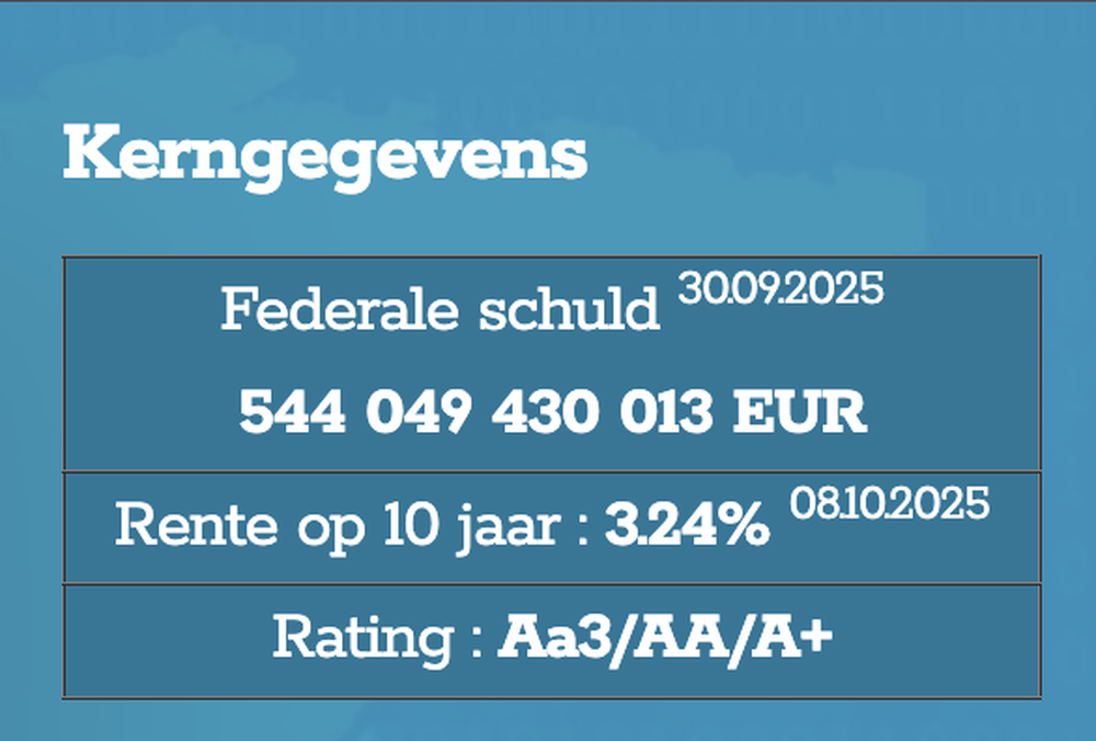 Per eind september 2025 bedroeg de schuld van de federale staat 544,485 miljard euro. De federale staatsschuld is daarmee met 7,35 miljard euro toegenomen tegenover de maand augustus.